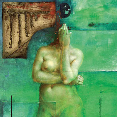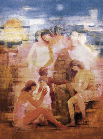 Protagoniste da sempre nella mia pittura, le figure femminili ricompaiono ora sotto il cielo di Casoli con l’urgenza di essere contrapposte all’orizzonte remoto segnato dalla vastità, che da qui si può cogliere, del mare. La ventosità della collina casolana mi induce a porre al collo delle mie figure dei foulards che, simili a vele, si librano al vento dell’Adriatico. Figure da me immaginate in luogo ove il vuoto determinato dagli ampi orizzonti mi restituisce il senso del pieno e la solitudine mi diventa completezza.