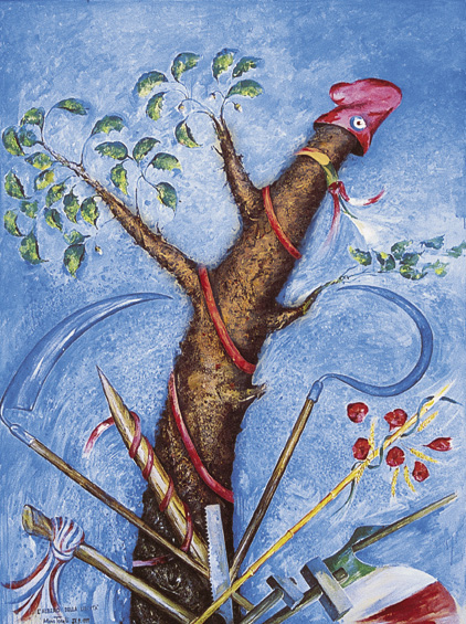L’albero della Libertà è un omaggio alla Rivoluzione francese e quindi al concetto di libertà, fraternità e uguaglianza. I simboli del lavoro umano, nelle sue forme del lavoro contadino (di cui sono emblemi la falce e il bastone per trebbiare) e del lavoro industriale (il martello), all’occasione possono diventare armi non convenzionali usate per la circostanza dal popolo che normalmente è inerme. Il berretto frigio è l’unico simbolo propriamente rivoluzionario che chiarisce quindi semanticamente il significato dell’opera.